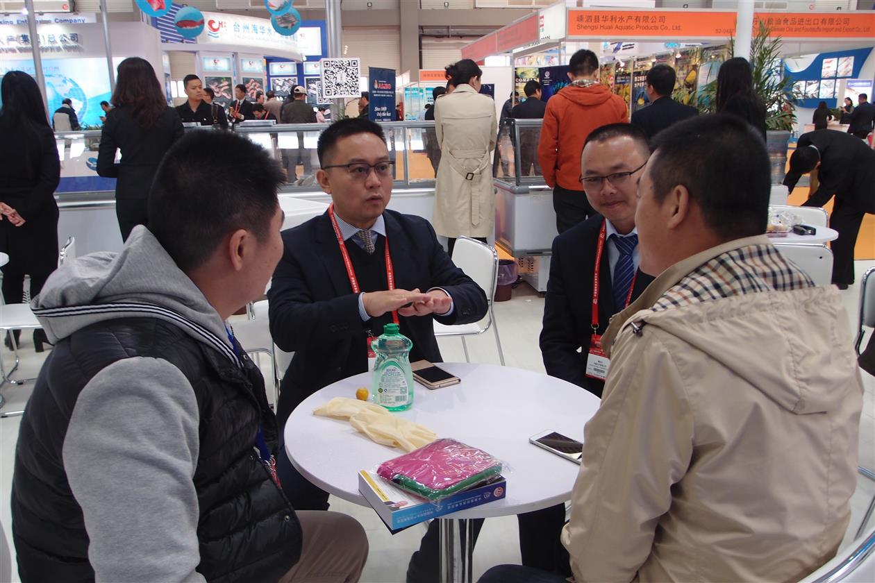 作为中国行业中规模最大、综合实力最强的远洋渔业企业,公司展出了超低温大目金枪鱼,马达加斯加白虾、莫桑比克大红虾等各类深水、浅水虾类产品,以及鱿鱼、墨鱼、章鱼、带鱼、竹荚鱼、狭鳕鱼、无须鳕、磷虾制品、鱼糜制品等多海域、多品种系列产品。公司推出了磷虾产品、章鱼产品的试吃,包括磷虾水饺、章鱼水饺、磷虾发糕、磷虾丸子、干炸磷虾,引来众多新老客户的品尝,并与工作人员进行了实质性的业务磋商。来自日本、新西兰、俄罗斯、西班牙、葡萄牙、美国以及国内相关企业等客商纷纷前来观看展品并表达了合作意向。公司展台大屏幕还实时滚动播放企业宣传片,展示内容涉及公司捕捞方式、墨鱼产品介绍等,也引来众多客户与参观者驻足观看。
