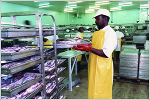 该项目包括一个捕捞项目和一个加工项目。有现代化加工厂一座。加工厂总面积8000余平方米,配有粗加工及精加工各类设备,拥有速冻平板20台,冷冻能力100吨/日,冷库储藏能力4000吨。完全符合欧洲和美国的卫生标准。